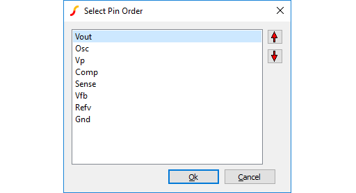 Show UpDownDialog(['Vout', 'Osc', 'Vp', 'Comp', 'Sense', 'Vfb', 'Refv', 'Gnd'], 'Select Pin Order')