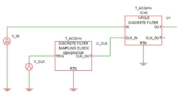 If the time of acquisition is ???MATH???\text{t}_{\text{ACQ}}???MATH???, then the "Sampling Clock Generator for Discrete Filters" will generate a pulse whose pulse width is equal to ???MATH???\text{t}_{\text{ACQ}}???MATH??? every time its "TRIG" input makes a positive transition exceeding 3V. During this pulse, the discrete filter will sample the input data at the "IN" input pin and it will take ???MATH???\text{t}_{\text{ACQ}}???MATH??? for it to satisfactorily acquire the input data. After ???MATH???\text{t}_{\text{ACQ}}???MATH??? has expired, the discrete filter will update its output, and the output will settle within a time duration less than or equal to ???MATH???\text{t}_{\text{ACQ}}???MATH???. In addition, during this duration when the output is updated, the output "CLK_OUT" is raised to a high value.