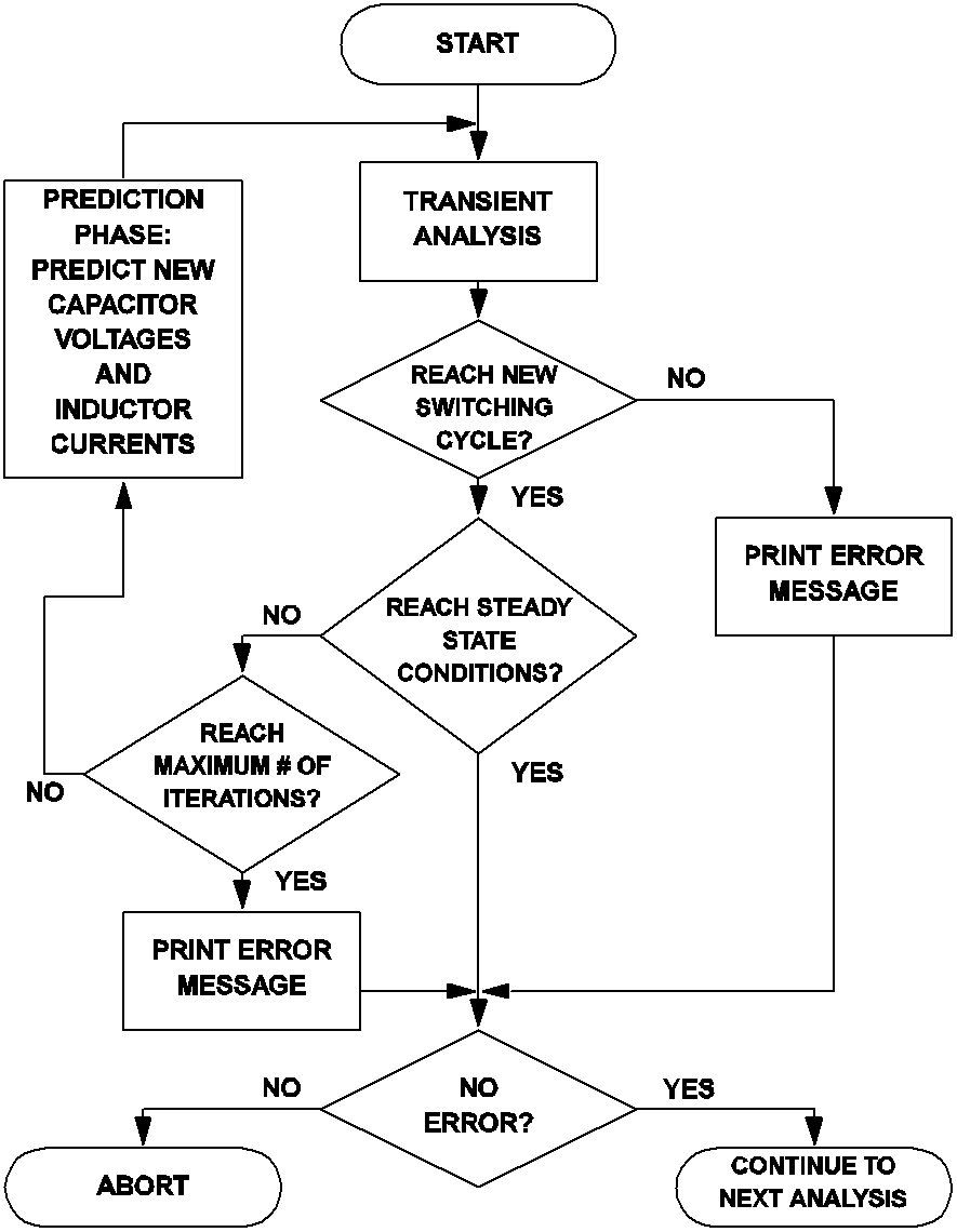 As pointed out earlier, the periodic operating point analysis must be the first analysis specified in an input file. As a result, the initial capacitor voltages and initial inductor currents at the start of the periodic operating point analysis are the same as those specified in the device statements and any overriding initial conditions supplied in the .INIT statements. Then, the periodic operating point analysis tool carries out a sequence of time-domain transient simulation on the system. The actions of the periodic operating point analysis are summarized by the flow chart in Fig 10.3.