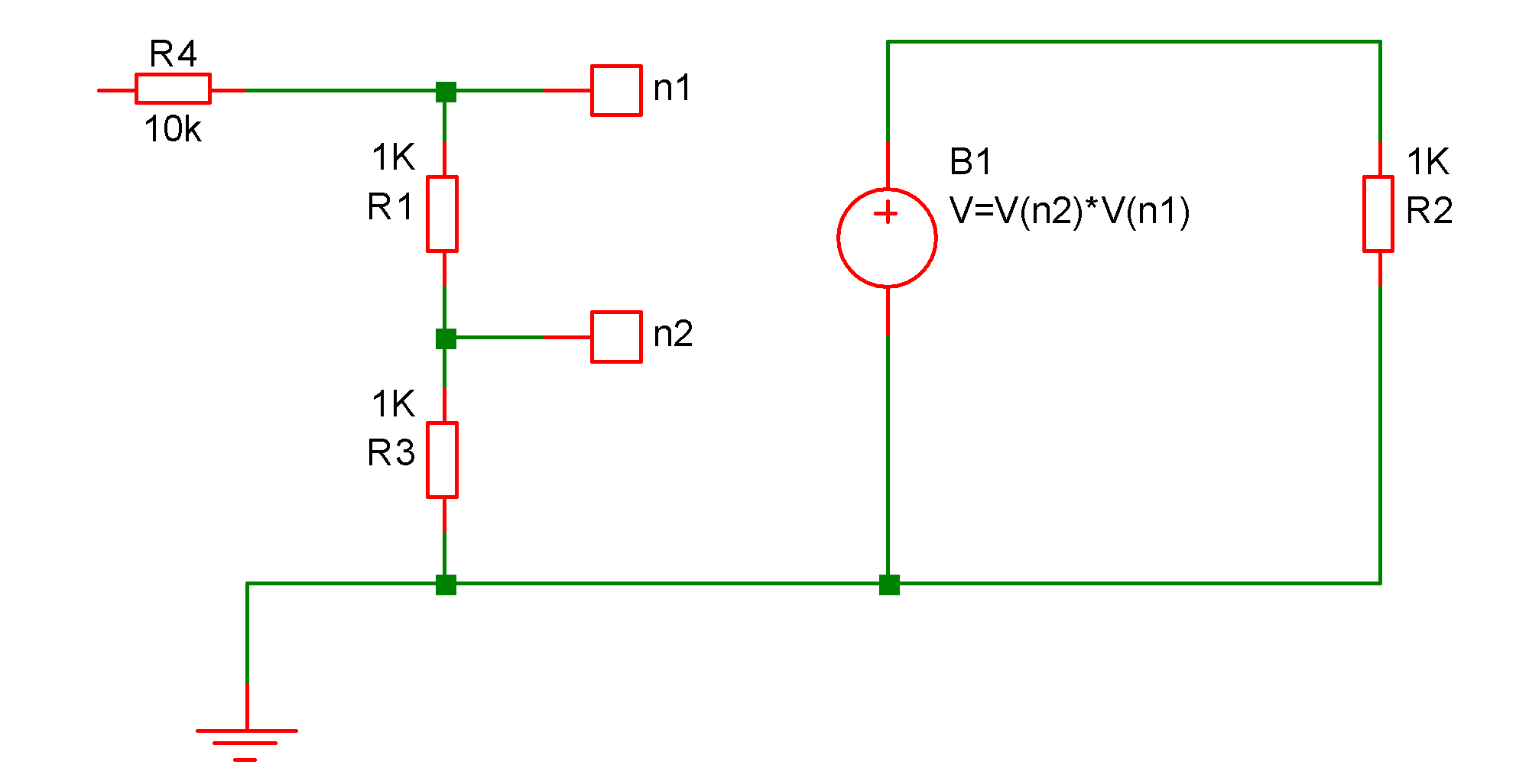 In the above circuit the voltage across B1 will be equal to the product of the voltages at nodes n1 and n2.