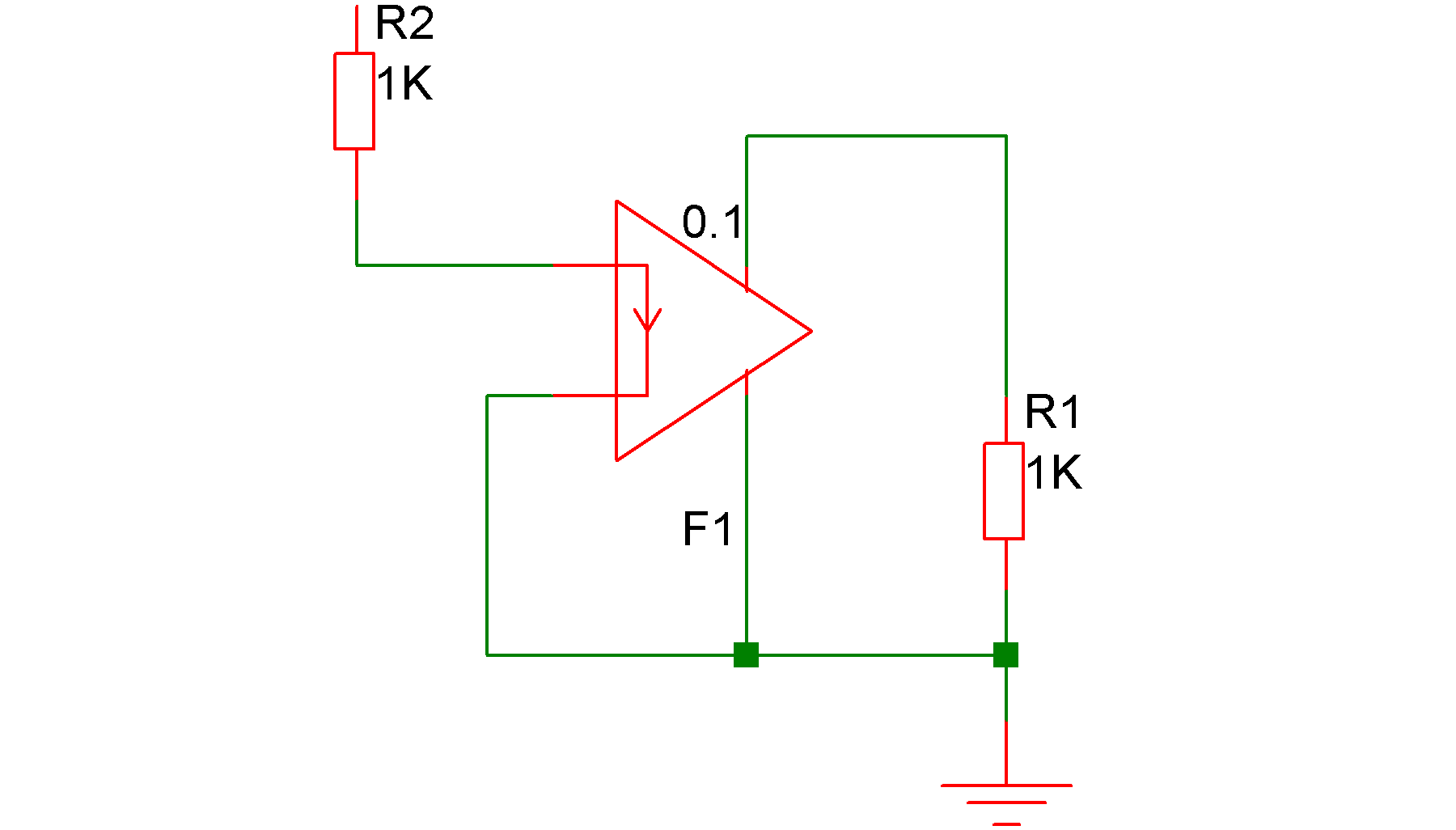In the above circuit, the current in the output of F1 (flowing from top to bottom) will be 0.1 times the current in R2.