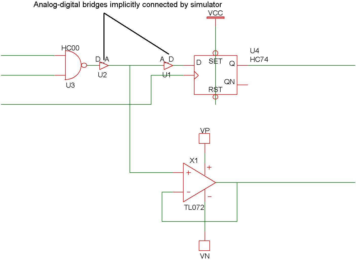 At the simulator level, there are two types of node namely analog and digital and they cannot be connected together. At the netlist level it is possible to connect analog components to digital outputs and inputs. When SIMetrix sees an analog component connected to a digital signal, it automatically interconnects them using an interface bridge. It will use an analog-digital bridge to connect an analog signal to a digital input and a digital-analog bridge to connect to a digital output. If you connect an analog component to a signal which connects to both digital inputs and outputs both types of bridge will be used and the digital inputs and outputs will be separated from each other as illustrated in the following diagrams.