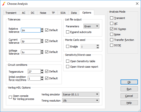 The simulator features a large number of option settings although, fortunately, the vast majority can be left at their default values for nearly all applications. A few option settings can be set via the Choose Analysis dialog box and these are described in the following sections. The remainder can be controlled using the simulator's .OPTIONS control details of which may be found in the Simulator Reference Manual/Command Reference/.OPTIONS.