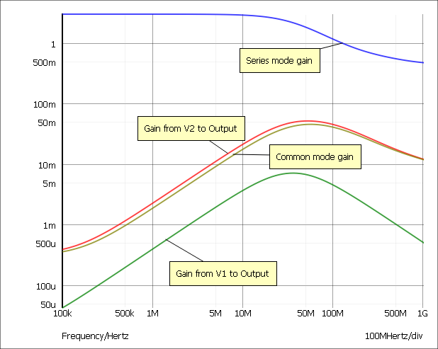 Transfer function analysis is similar to AC analysis in that it performs a swept small signal analysis. However, whereas AC analysis calculates the response to all circuit nodes from a (usually) single input source, transfer function analysis calculates the individual responses from each source in the circuit to a single specified output node. This allows, for example, the series mode gain, common mode gain and power supply rejection of an amplifier to be measured in one analysis. The same measurements could be performed using AC analysis but several of them would need to be run. Transfer function mode also calculates output impedance or admittance and, if an input source is specified, input impedance.