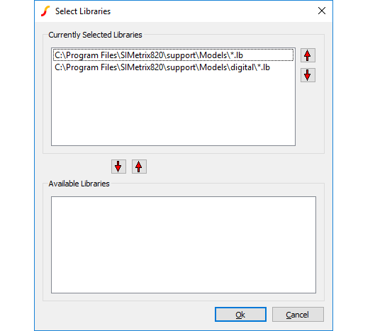 Select the items you wish to install in the lower box and transfer them to the upper box by pressing the Add button. You can also change the order of the items in the upper box. This affects the search order when a simulation is run. Click Ok. You will see a message displayed in the command shell 'Model library changed. Rebuilding catalogs, please wait...'. When finished the message 'Completed' will be displayed. The electrical model or models are now installed.