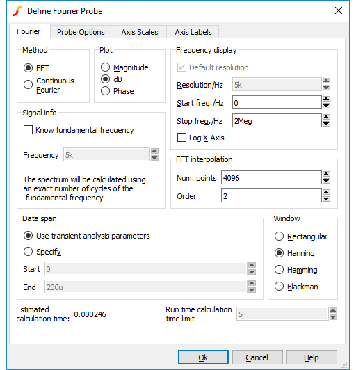 If using the Continuous Fourier method, you can enter a maximum time limit to calculate the Fourier spectrum. If the limit is exceeded, the calculation will abort and no display will be made. The Continuous Fourier calculation time can be excessive but cannot be predicted before the simulation is started as it is necessary to know the number of simulation time points to be processed.