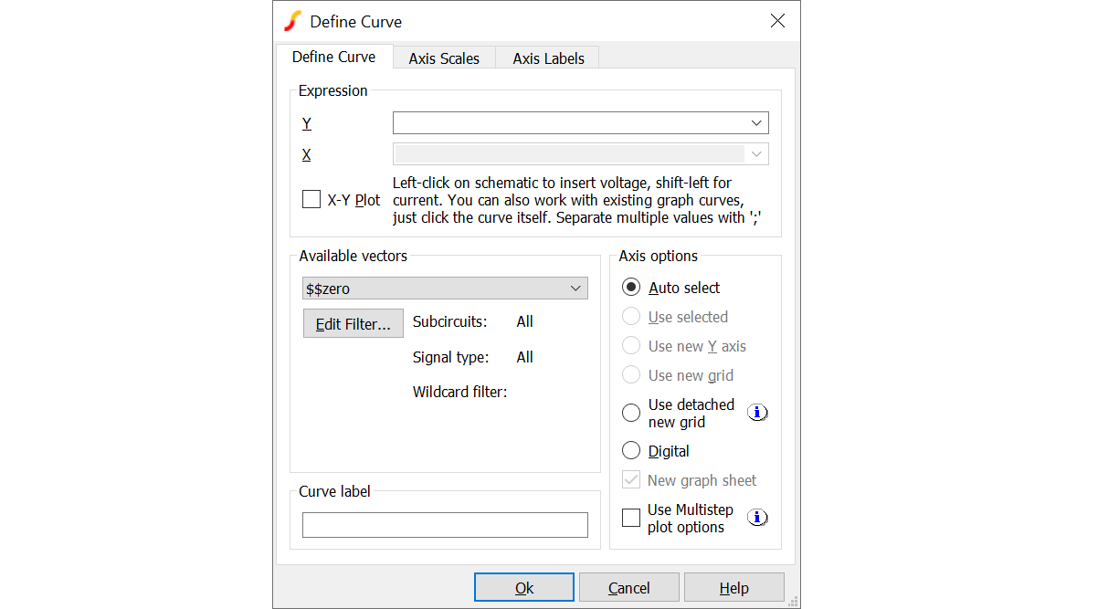 | Digital | Create a new digital axis. Digital axes are placed at the top of the window and are stacked. Each one may only take a single curve. As their name suggests, they are intended for digital traces but can be used for analog signals if required |