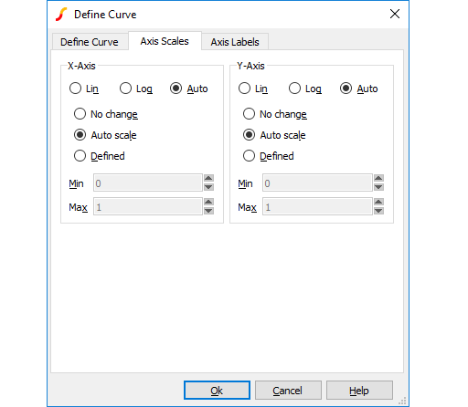 | Lin/Log/Auto | Specify whether you want X-Axis to be linear or logarithmic. If Auto is selected, the axis (X or Y) will be set to log if the x values are logarithmically spaced. For the Y-axis it is also necessary that the curve values are positive for a log axis to be selected. |