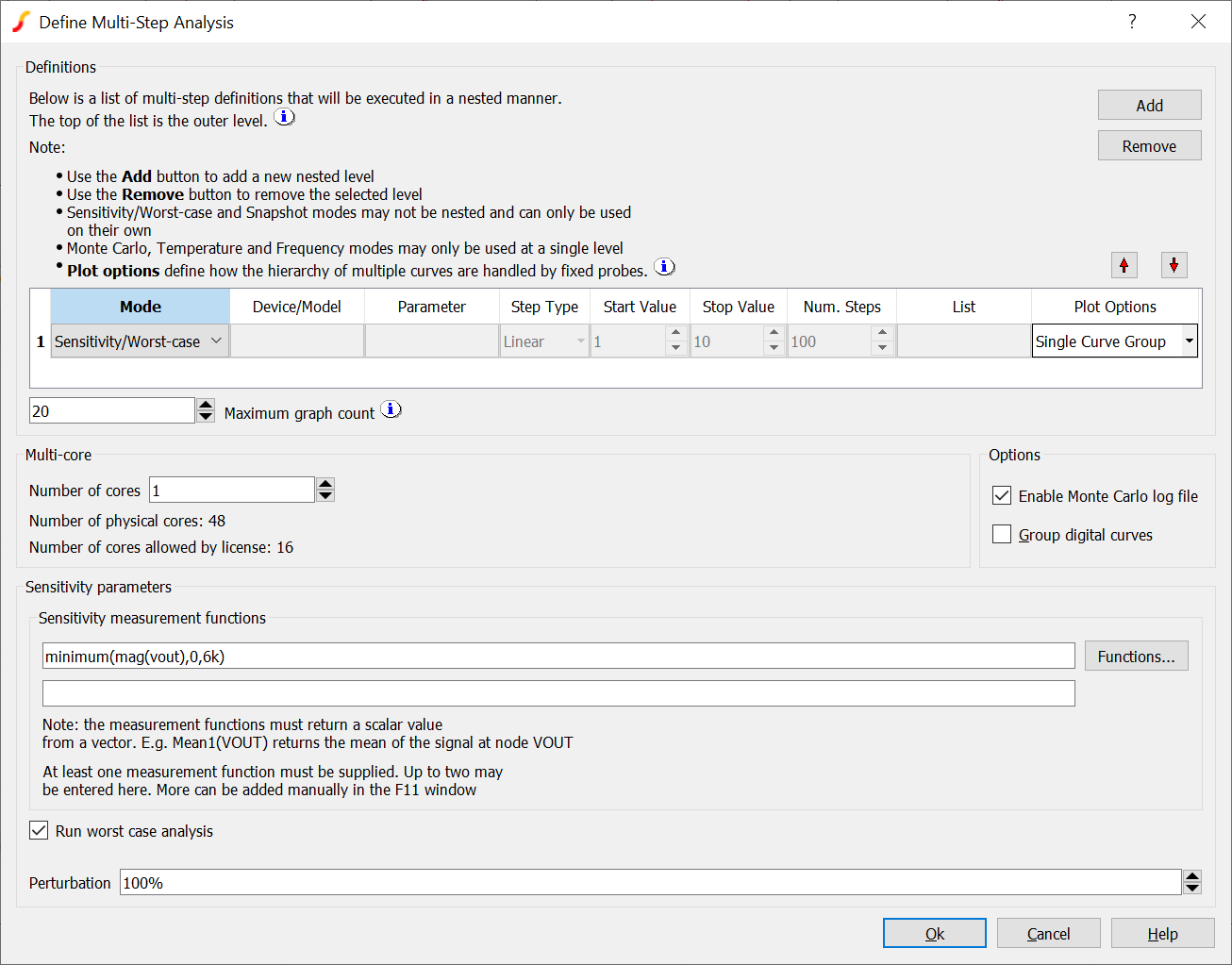 The outlying green and red curves are the worst-case results while the remaining curves are the sensitivity results. Each of the sensitivity curves is the result of running the simulation with a single component value perturbed so that it is set to its highest value within the tolerance specification. The worst-case curves are the result of running the simulation with all components perturbed at one or other tolerance extreme. Which extreme to use is determined from an analysis of the sensitivity results so as to maximise and minimise the sensitivity measurement function.