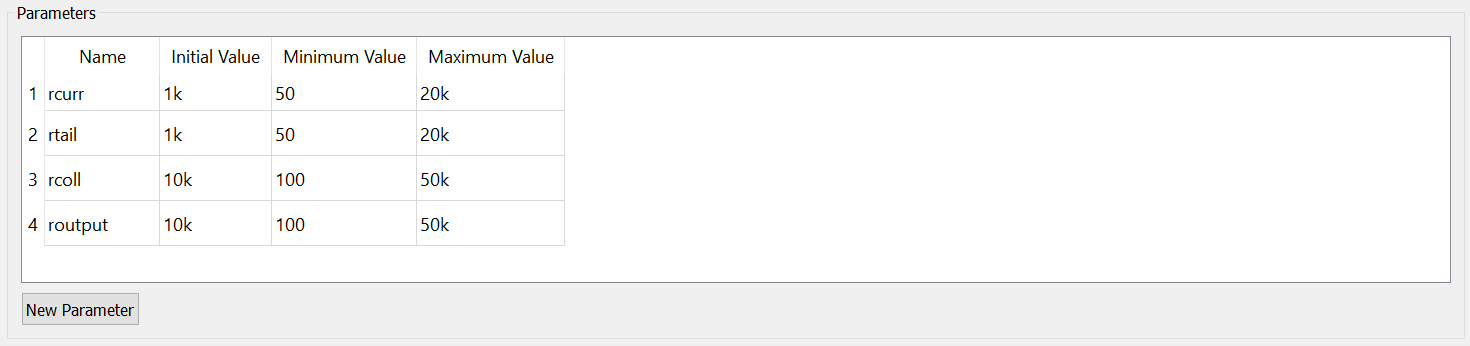 Click on the New Parameter button to create a new parameter. To delete an existing parameter, select the parameter row then press the Delete button.