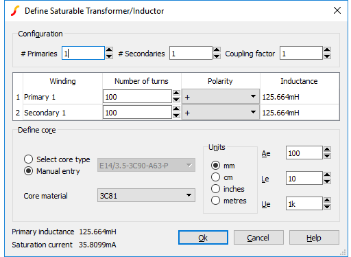 The standard user interface for both saturable and ideal transformers provide only limited flexibility to specify inter-winding coupling factor. In the majority of applications, coupling factor is not an important issue and so the standard model will suffice.