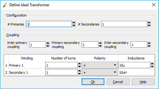 To define an ideal transformer, select the menu . This will open the following dialog box: