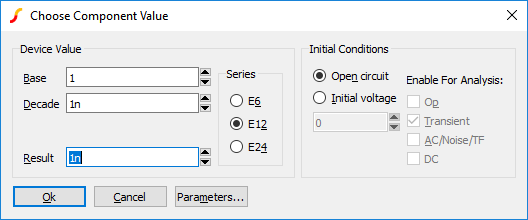 The device value is edited in the same manner as for resistors. You can also supply an initial condition that defines how the device behaves while a DC operating point is calculated. For capacitors you can either specify that the device is open circuit or alternatively you can specify a fixed voltage. For inductors, the device can be treated as a short circuit or you can define a constant current.