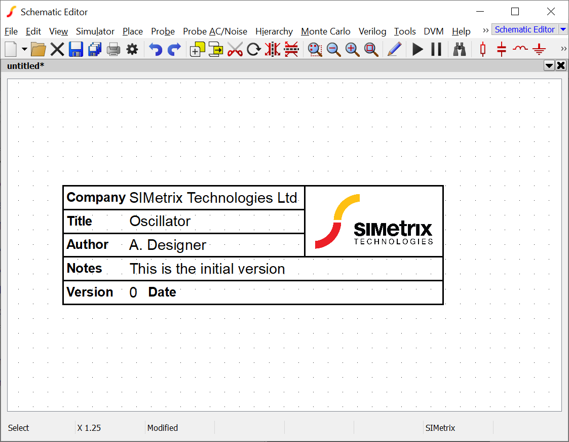 To create a title block, use the menu , which will open a window asking for schematic information. The information provided here will be placed into the title block annotation in the same line format as given, so you may need to add line breaks if necessary.