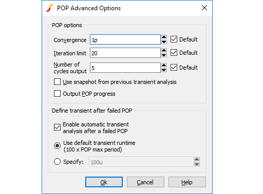 | Use snapshot from previous transient analysis | If checked, POP is instructed to take advantage of the last data point of a previous transient simulation, assuming the circuit and the initial conditions remained the same between the two simulation runs. |