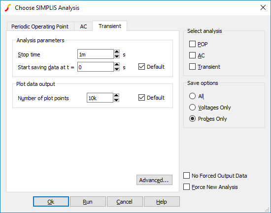 SIMPLIS offers three analysis modes namely Transient, AC and Periodic Operating Point or POP. These analysis modes are described in detail in the SIMPLIS Reference Manual. The meaning of each of the controls is described in this chapter.