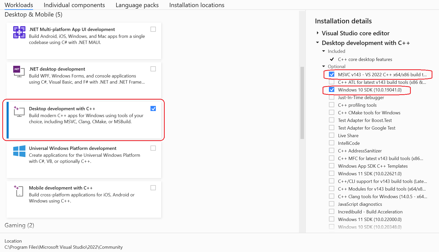 The picture below shows the minimal installation required for Visual Studio 2022 Community Edition. Enterprise and Professional editions require the same options.