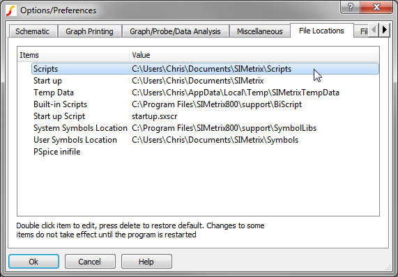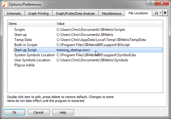 When you run a script, SIMetrix/SIMPLIS searches for the script file in a limited set of directories. One of these directories is your personal script directory, so for the training scripts, you will save the scripts to this directory. The full file path to your personal script directory is set in the Options/Preferences dialog. To find the location of your personal scripts directory, follow these steps: