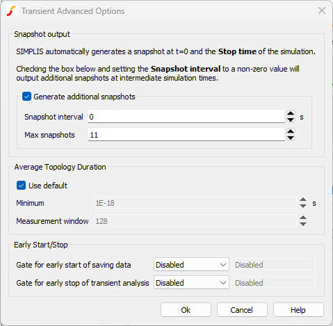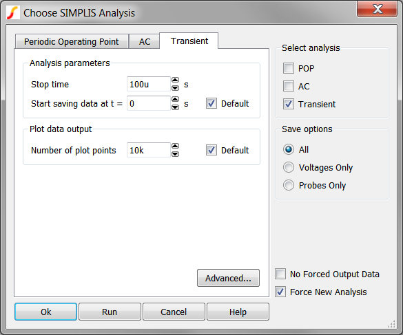 At first glance, the SIMPLIS transient analysis appear to be just like a SPICE transient analysis. Both simulators have start and stop time controls and a way to control the number of data points.