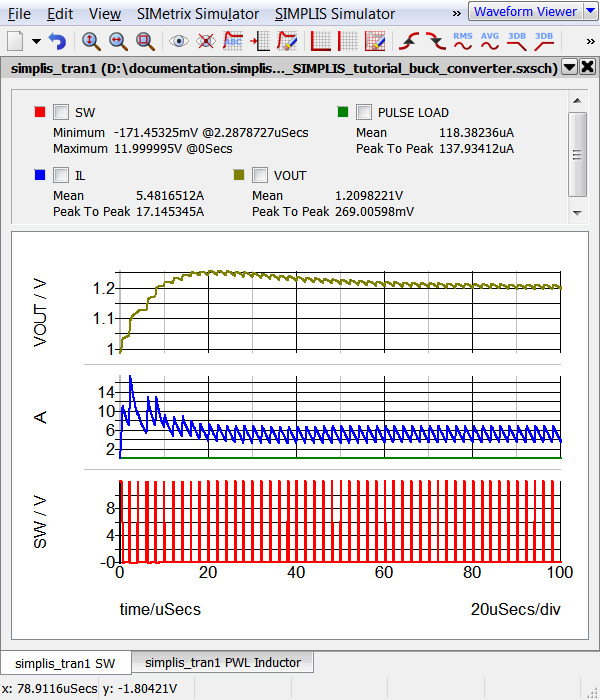 You will now run the transient simulation from 0 to 100μs. Before launching the simulation, you will clear the messages from the SIMPLIS Status window. To run the simulation,