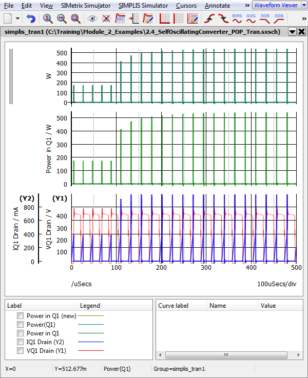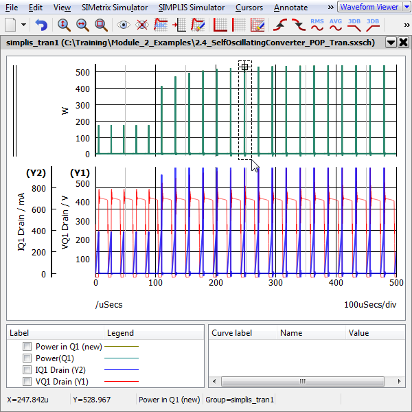 - In the waveform viewer, left-click on the curve with the label Power(Q1)
