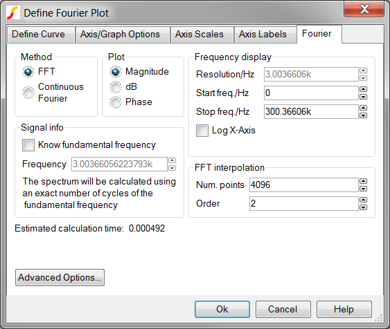 • Fourier() - this function calculates a continuous Fourier transform of the time-domain data. It uses an integration technique, and is therefore susceptible to errors caused by excessively large time steps.