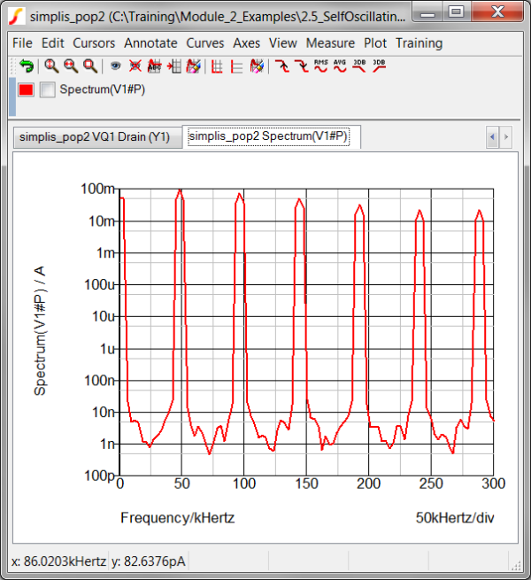 Result: The frequency spectrum for the input current is plotted on a new graph tab. The default settings will calculate the spectrum using the FFT algorithm, and the plot is on a new graph sheet because the X-axis is in Frequency, not time.
