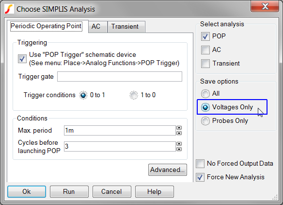 4. From the schematic menu, select Simulator > Choose Analysis... Choose Analysis... menu option. The keyboard shortcut F8 will execute this menu item.