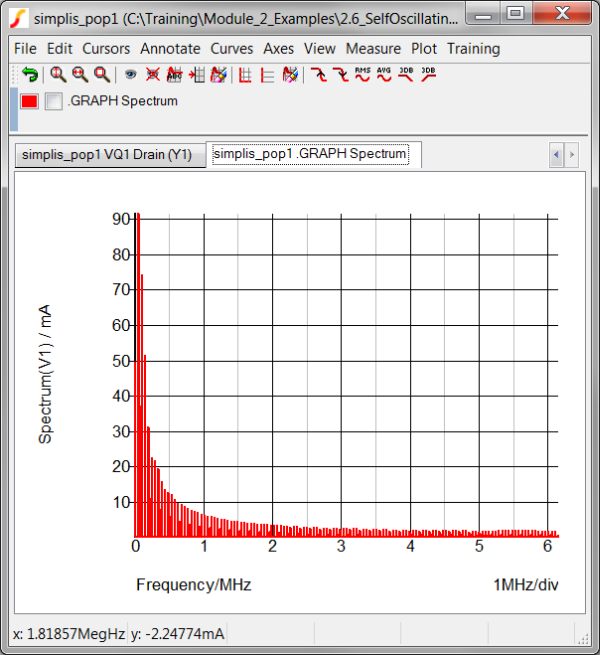 Result: The POP simulation executes and the frequency spectrum of the current in V1 is automatically plotted on the waveform viewer: