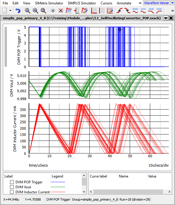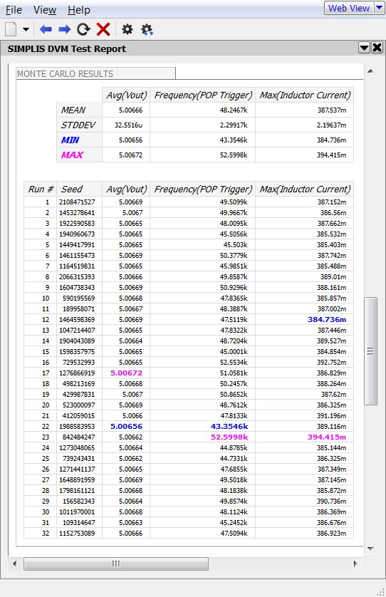 Note that run #22 is the simulation with the lowest frequency. It should be pointed out that DVM doesn't produce different results than a ordinary SIMPLIS Monte Carlo simulation. Instead, DVM automates the process of setting up the schematic and collecting the results into a HTML formatted report.