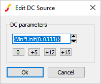 You assign statistical distribution functions to component values like any other parametrized value. The statistical distribution function and the nominal value must be enclosed in the curly braces {}, indicating the value is an expression to be evaluated. For example, a 1kΩ, 5% resistor with a Gaussian distribution was a value of: