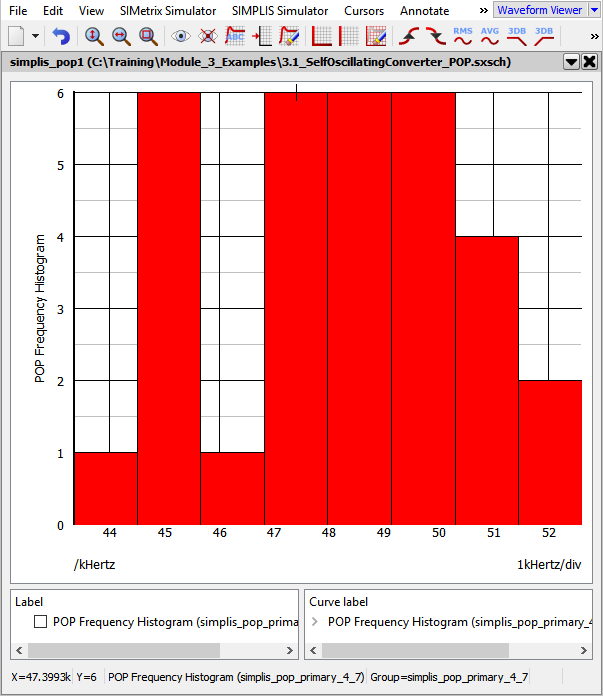 SIMetrix/SIMPLIS has an extremely powerful histogram plotting function. In the last exercise, you executed 32 simulations to get a valid statistical sample, and the histogram plotting functions requires a minimum of 16 runs. In the next exercise you will create a probe to plot the histogram for the converter switching frequency.
