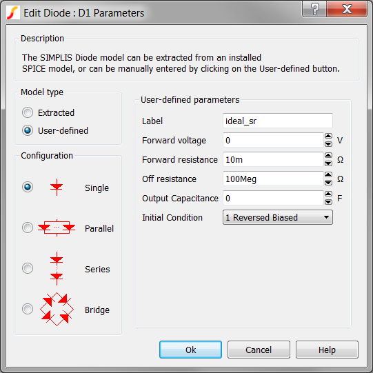 All semiconductor symbols used in SIMPLIS schematics call a electrical model which has PWL transfer characteristics. The model parameter extraction algorithms execute SIMetrix SPICE simulations on the SPICE model and curve fit a PWL model to the SPICE simulation curves. In contrast to the user-defined model in this exercise, a parameter extracted diode would have a forward voltage drop and three PWL segments, as opposed to the two segment model used in the user-defined diodes.