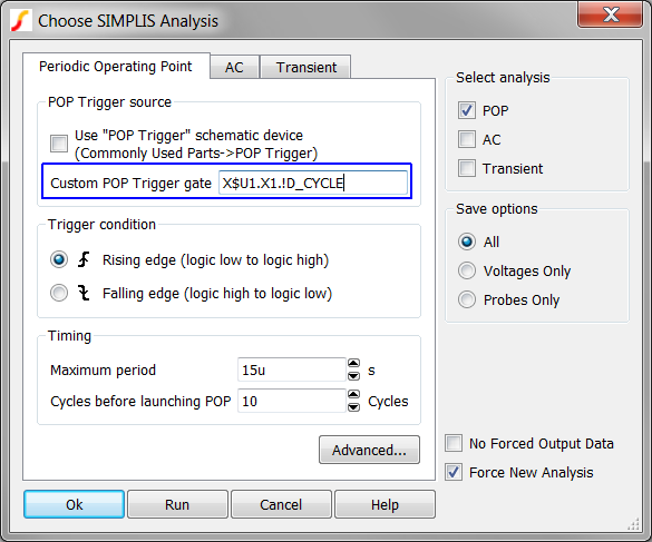 When the ASCII model for the LLC Modulator was created in the third exercise, the program searched out the POP Trigger gate information and placed the trigger gate information in the library file as a comment. In this exercise you will copy that information and change the POP Analysis to use this fixed trigger gate.