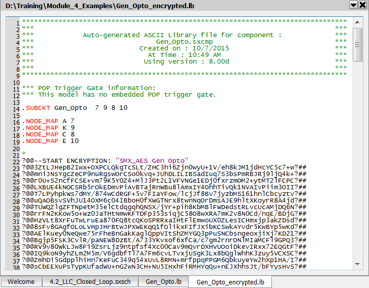 Notice that the files are identical up to line #22 where the encryption start tag is located. The encryptor reads the plain text Gen_Opto.lb library file and encrypts all text between the start and end tags, generating the encrypted model library file Gen_Opto_encrypted.lb.
