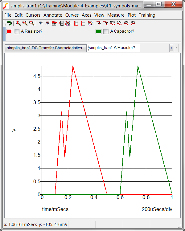 transient simulation executes and the waveforms for the resistor and capacitor