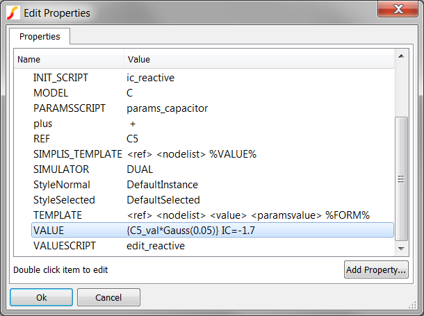 The point here is that although the parameter value is defined in the F11 window, the expression containing the parameter must be stored on the VALUE symbol property so that the netlist entry can be generated. As the netlister processes each symbol, it does not know the parameter value is defined in the F11 window. Instead, the netlister simply substitutes the VALUE symbol property into the SIMPLIS_TEMPLATE in place of the text %VALUE%.