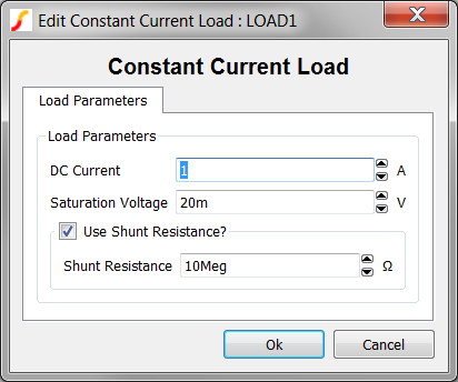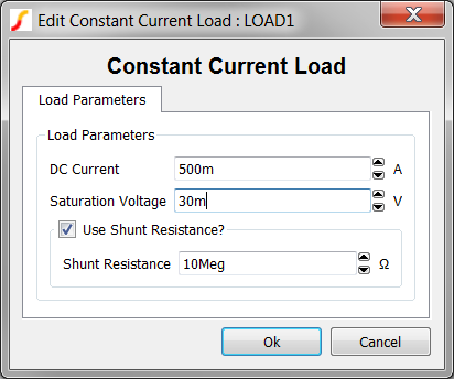 - Change the DC Current value to 500m, and change the Saturation Voltage parameter to 30m and click Ok to accept the dialog. The dialog should appear as follows: