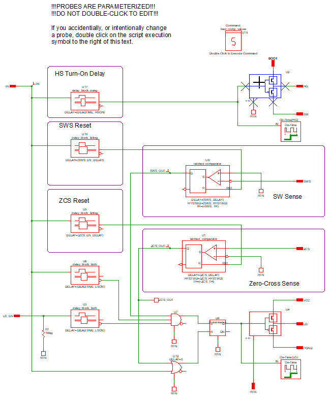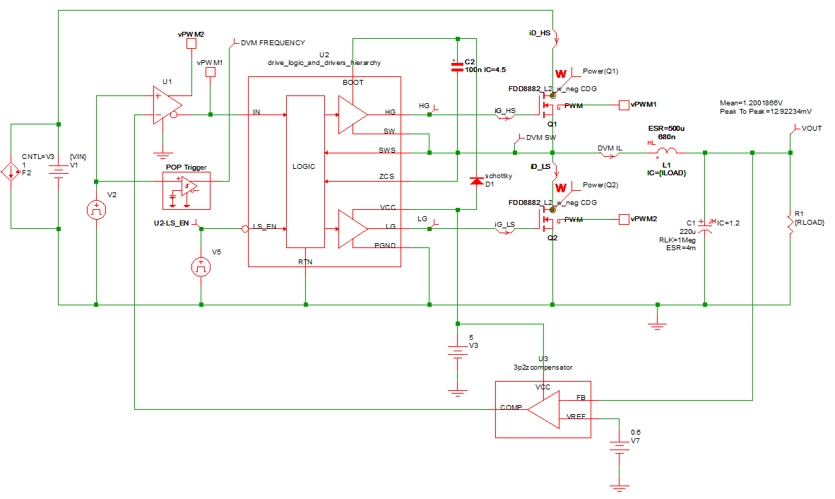 4. There are two SIMPLIS multi-level MOSFET driver blocks in this schematic. U2 in this subcircuit controls the drive signals for the high-side power MOSFET Q1 and U4 controls the drive signals for the low-side power MOSFET Q2.
