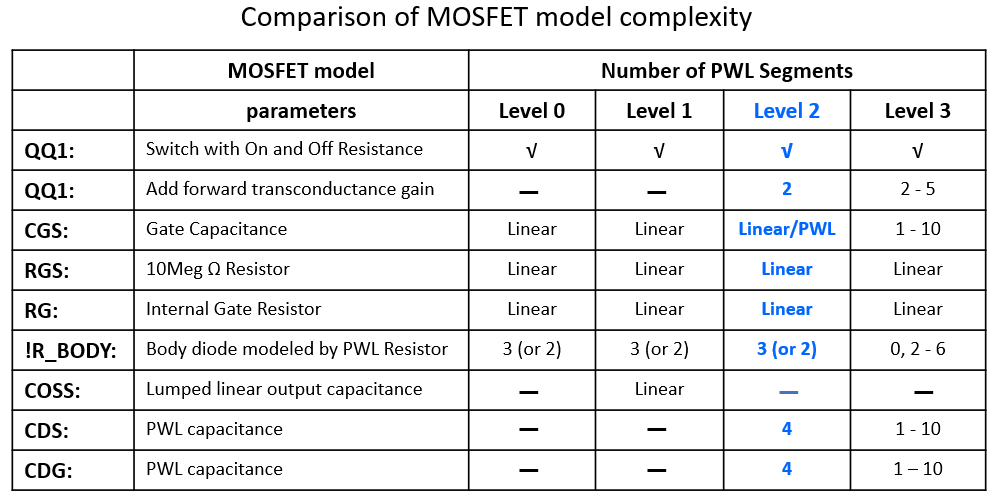 In the tabel below we compare the complexity of the four supported SIMPLIS MOSFET levels. The characteristics of the Level 2 model are highlighted in blue.