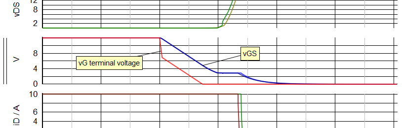 As we shall see directly, this would be very difficult to ascertain if we included the gate resistor inside the MOSFET model and only had access to measure the gate terminal voltage.