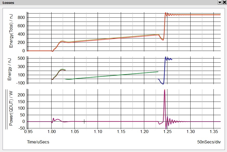 Here we see in the top grid the total energy dissipated during the course of the switching cycle. The middle grid shows the break out of the energy dissipated during the turn-ON transient, the conduction period and the turn-OFF transient. The last value of each curve is the result of the integral of the energy dissipated over its respective interval. The lower grid shows the instantaneous power dissipation of QDUT during this switching transient.