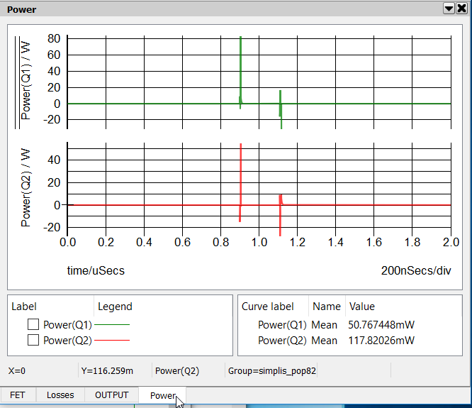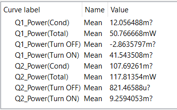 In the rectangular box labeled MOSFET Loss Analysis we have four arbitrary probes that measure power dissipated in the MOSFET. The probe on the bottom, labeled Power(Total) measures the total instantaneous power dissipated in the MOSFET over the entire simulation interval. By taking advantage of the POP analysis where we can arrange to present an exact integral multiple number of switching periods, in this case exactly one switching period, we can then easily measure the average of the instantaneous power dissipated in each power switch.