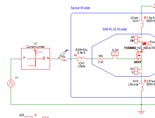 Even when we just seek to compare the behavior of Spice and SIMPLIS MOSFET models we must be extremely careful to have exactly the same test bench in both simulators. Begin by opening the testbench schematic for comparing a Spice MOSFET model with the same device modeled in SIMPLIS, apps_b_1_FDD8882_testbench.sxsch, which is shown below.