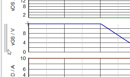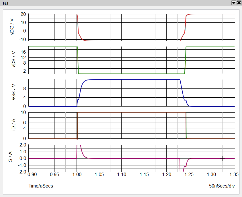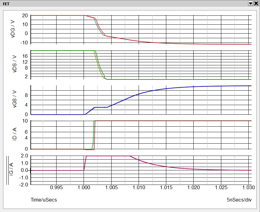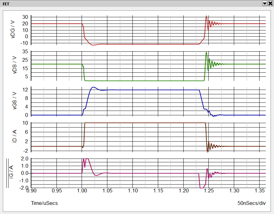 2. In the waveform viewer go to the tab labeled "FET". Zoom in on the time axis to a time window of approximately t = 0.9 uS to t = 1.35 uS. From the top are displayed vDG, vDS, vGS, iD and iG.