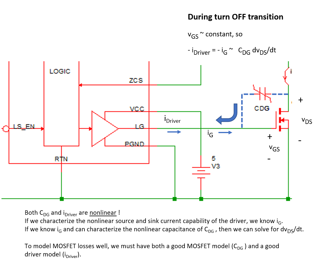 As discussed earlier, the nonlinear current limitations of the MOSFET driver and combine with the nonlinear capacitance CDG of the power MOSFET to dominate the shape of the vDS voltage transition. The shape of this voltage transition has a first order impact on the switching losses of a switching power supply.