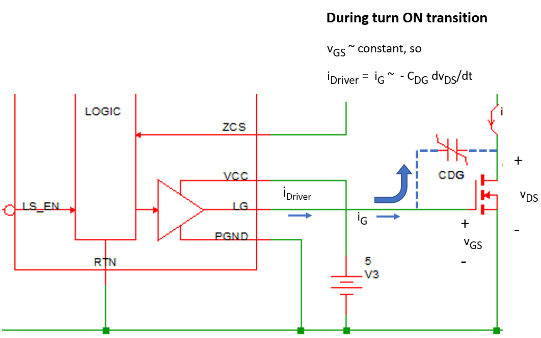 During the turn-ON transient of a MOSFET under an inductive load, the MOSFET current is essentially constant during the entire voltage transition from OFF to ON. Consequently, the gate voltage vGS is also nearly constant during the voltage transition of vDS. During this transition, the gate current iG = -CDG dvDG/dt ~ -CDG dvDS/dt. Since the driver current iDriver = iG, we can conclude that during the switching transitions, iDriver ~ -CDG dvDS/dt. As we have pointed out previously, the drain-to-gate capacitance CDG is highly nonlinear. So also is the driver current. However, if we can characterize both of these nonlinearities, we can predict with very high accuracy the shape of vDS during these switching transitions.