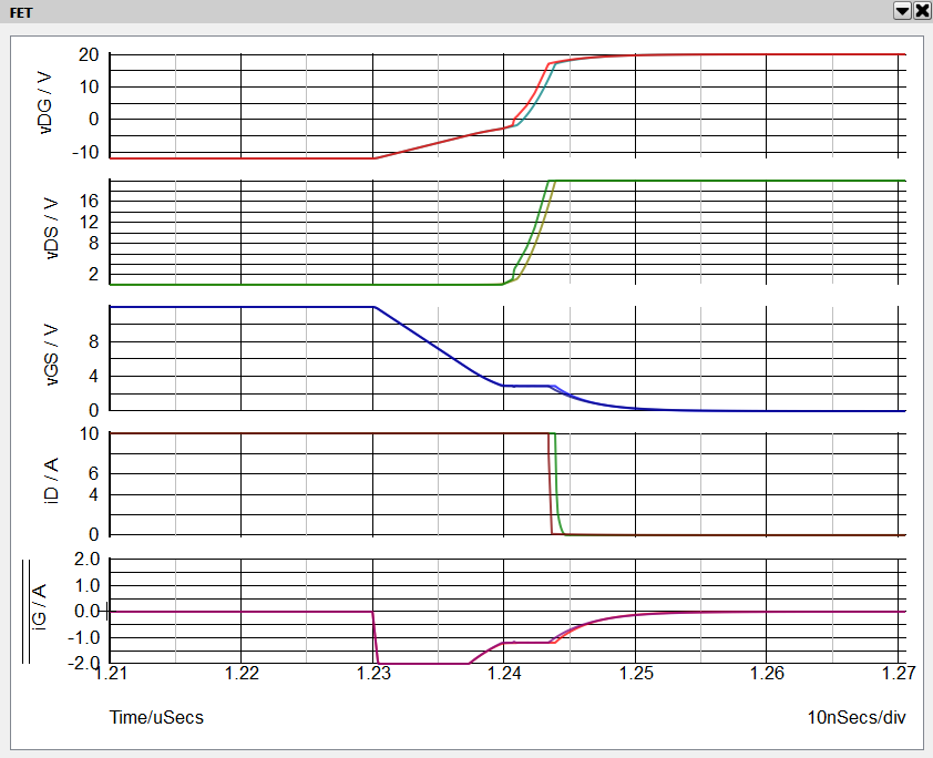 5. Next zoom in to the turn-OFF transient from about t = 1.21 uS to t = 1.27 uS. Again we can see the Miller plateau on the vGS waveform during the vDS voltage transition.