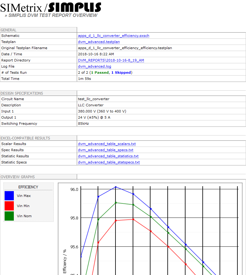 | 20 | lcv\apps_d_1_llc_converter_efficiency_efficiency_reset.compvalues.txt | NoSimulation | Efficiency|Generate Efficiency Curves | CreateXYScalarPlot( AVG(ILOAD), Efficiency_360, AVG(ILOAD) Efficiency_360, DVM Vin Min, DVM Efficiency , A1, vert, usescalars=multi xlabel=Load Current xunits=A ylabel=Efficiency yunits=%%% showpoints=true color=red ) | CreateXYScalarPlot( AVG(ILOAD), Efficiency_380, AVG(ILOAD) Efficiency_380, DVM Vin Nom, DVM Efficiency , A1, vert, usescalars=multi xlabel=Load Current xunits=A ylabel=Efficiency yunits=%%% showpoints=true color=green ) | CreateXYScalarPlot( AVG(ILOAD), Efficiency_400, AVG(ILOAD) Efficiency_400, DVM Vin Max, DVM Efficiency , A1, vert, usescalars=multi xlabel=Load Current xunits=A ylabel=Efficiency yunits=%%% showpoints=true color=blue ) | PromoteGraph( DVM Efficiency , 1 ) |