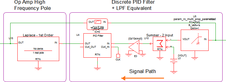 The first objective in step 5 is to switch out all of the discrete time components with their SystemDesigner equivalents and prepare the circuit to simulate with Double Precision Floating Point math. This simulation will allow you to run an AC analysis and check the accuracy of your circuit. The circuit in apps_e_step_5a_sd_pid_filter.sxsch is set up to run an AC analysis with the following SystemDesigner PID implimentation: